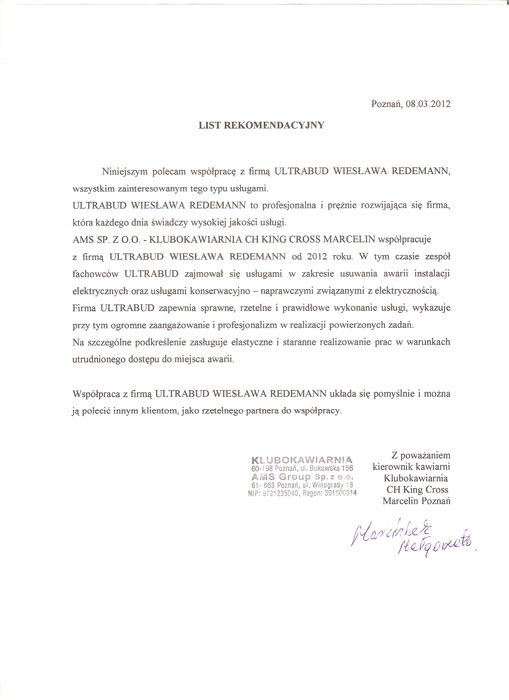 ULTRABUD Remigiusz Ogrodnik ul Grochowska 94/7 60 - 335 Poznań POGOTOWIE ELEKTRYCZNE 24h tel: 600 647 578